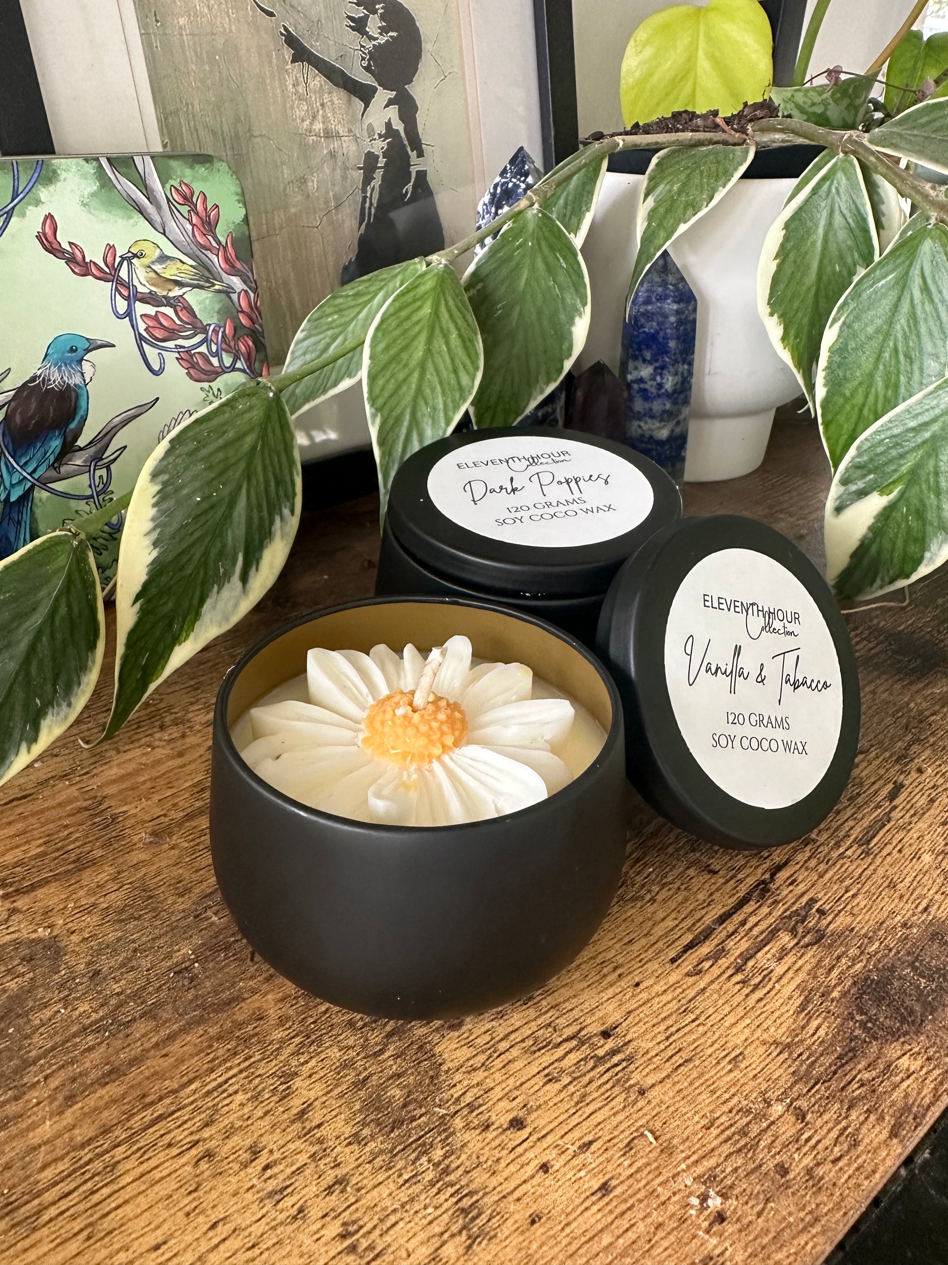 Elevate your space with the perfect blend of fragrance and design. Housed in a sleek black tin, this candle captures the essence of your favorite designer perfumes — rich, sophisticated, and subtly intoxicating. Topped with a handcrafted daisy, it’s a striking piece that brings both beauty and scent to any room. Ideal for gifting or indulging in everyday luxury, the Velour Bloom Candle transforms your home into a sanctuary of elegance and floral allure.